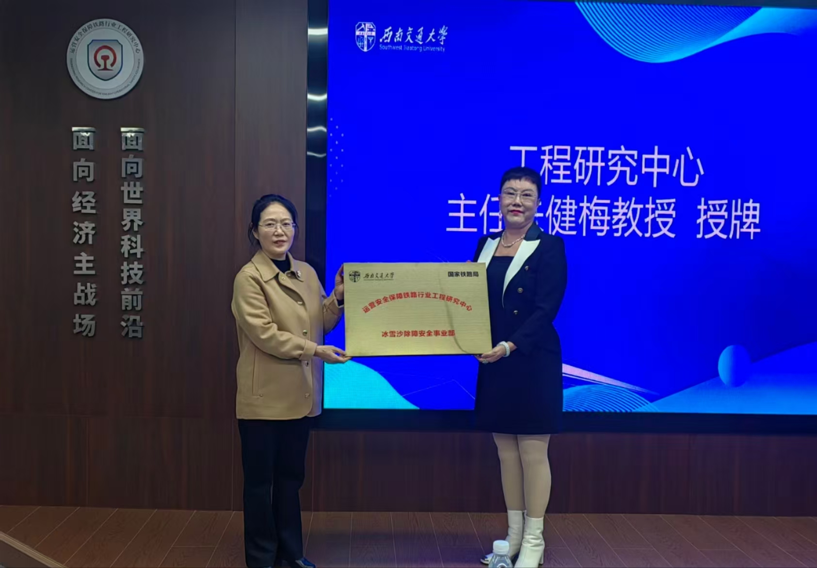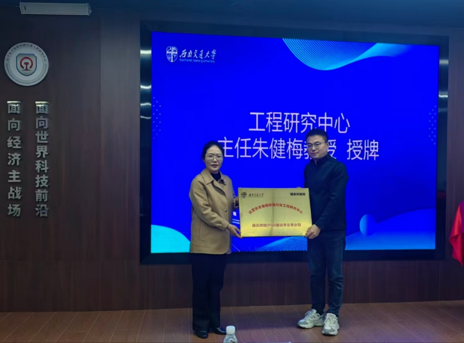 2025年10月24日下午15:00在西南交通大学九里校区运营安全保障铁路行业工程研究中心召开专业事业部成立大会。会议由专职副主任洪兵主持,沈阳强信通信技术有限公司董事长关晓庆、成都办事处主任王峰,成都办事处副主任包韵涵;山西云通时代科技有限公司董事长张继琴,总经理郑鹏;四川西南交大铁路发展股份有限公司副总经理刘莉;轨道交通运输仿真与人因安全团队;中心主任朱健梅教授,中心常务副主任帅斌教授,副主任刘帆洨等参加本次会议。会上,中心常务副主任帅斌教授进行致辞,对“通讯网络IPv6建设安全事业部”和“冰雪沙除障安全事业部”两个专业事业部的成立表示衷心的祝福和殷切的期盼。中心主任朱健梅教授进行事业部成立授牌,参会成员对事业部未来发展方向,如何引进新技术,获得新突破进行充分交流。